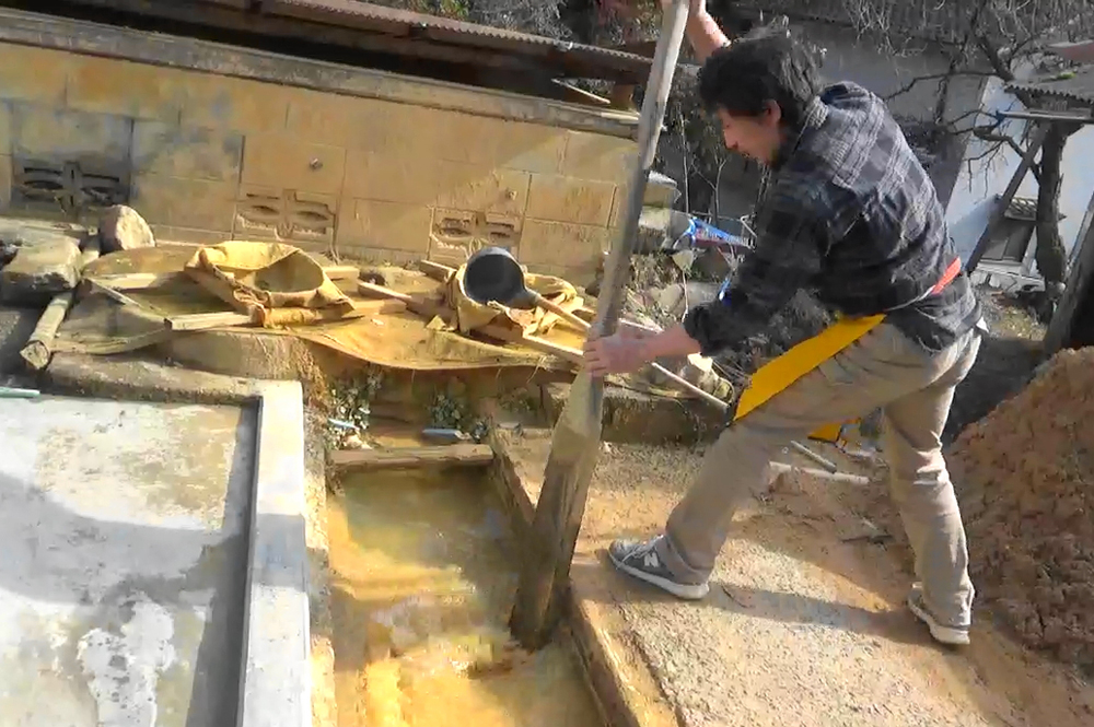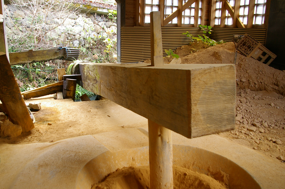 山から採取した土を唐臼で細かくします。